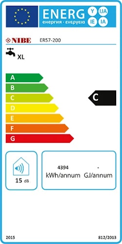 Exempel på energimärkningsetikett på varmvattenberedare.