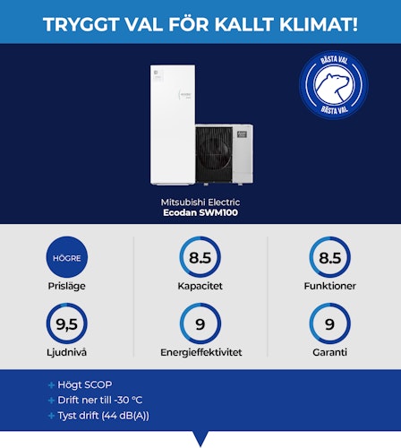 Mitsubishi Electric Ecodan SWM100 är en energieffektiv luft/vattenvärmepump som erbjuder en bra balans mellan prestanda och pris. Med en värmeeffekt på upp till 9,3 kW och en hög SCOP är den ett stabilt val för villor med medelstort värmebehov.