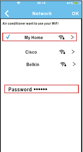 Välj ditt nätverk (nätverket på bilden fungerar endast som referens) och skriv in lösenordet till ditt trådlösa nätverk. Tryck sedan på [OK].
