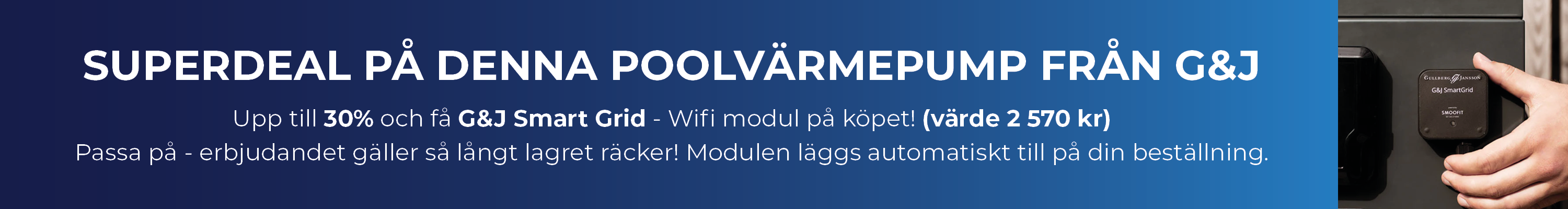 Här hittar du effektiva och energibesparande poolvärmepumpar från Gullberg & Jansson. Gullberg Janssons poolvärmepumpar är utvecklade och designade i Sverige och kännetecknas av hög kvalitet, låg ljudnivå och för att de är miljövänliga. En poolvärmepump från Gullberg & Jansson kan enkelt installeras på redan befintligt poolsystem. Dessutom förlänger du badsäsongen från tidig vår till sen höst genom att använda en poolvärmepump.