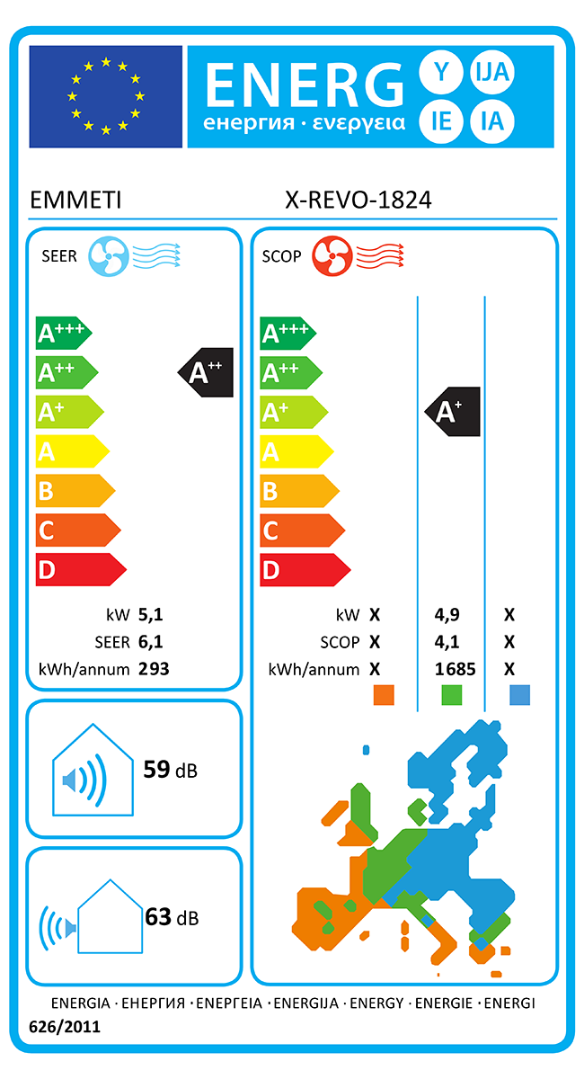 X-REVO luft/luftvärmepump med inverterstyrning, med inomhus- och utomhusenhet. R32 Köldmedium.
