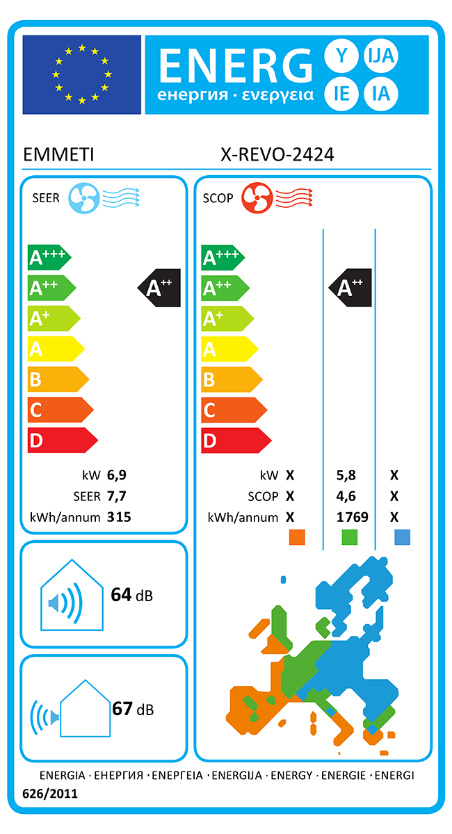 X-REVO luft/luftvärmepump med inverterstyrning, med inomhus- och utomhusenhet. R32 Köldmedium.